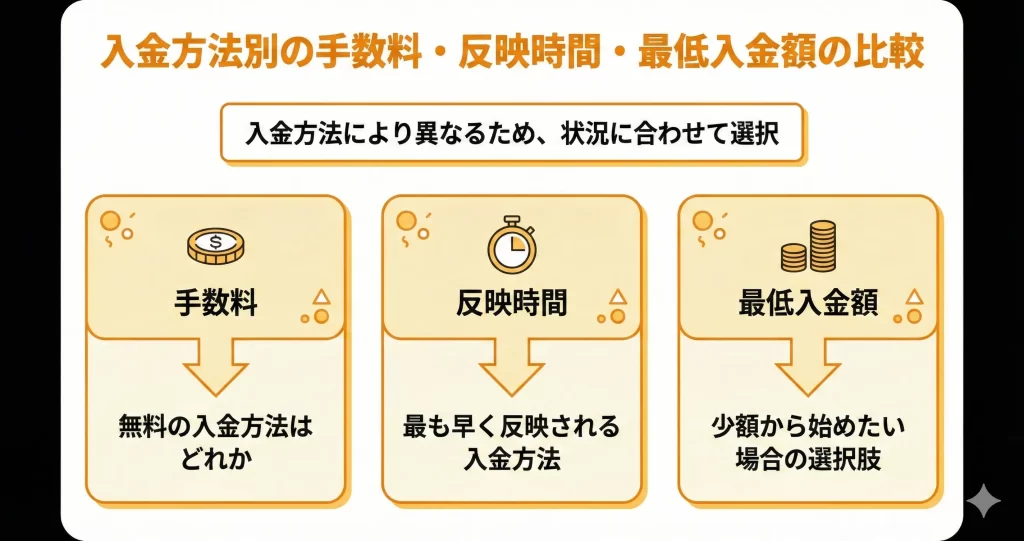 入金方法を選ぶ際は、以下の3つの軸で比較すると判断しやすくなります。
