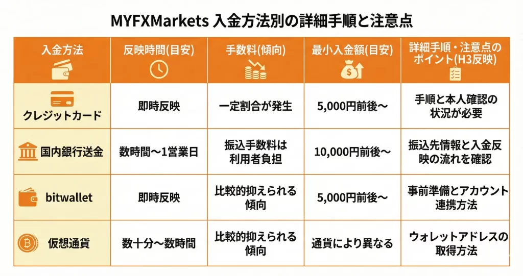 MYFXMarketsは複数の入金方法に対応していますが、それぞれ手数料や反映時間が異なるため、自分に合った方法を選ぶことが重要です。