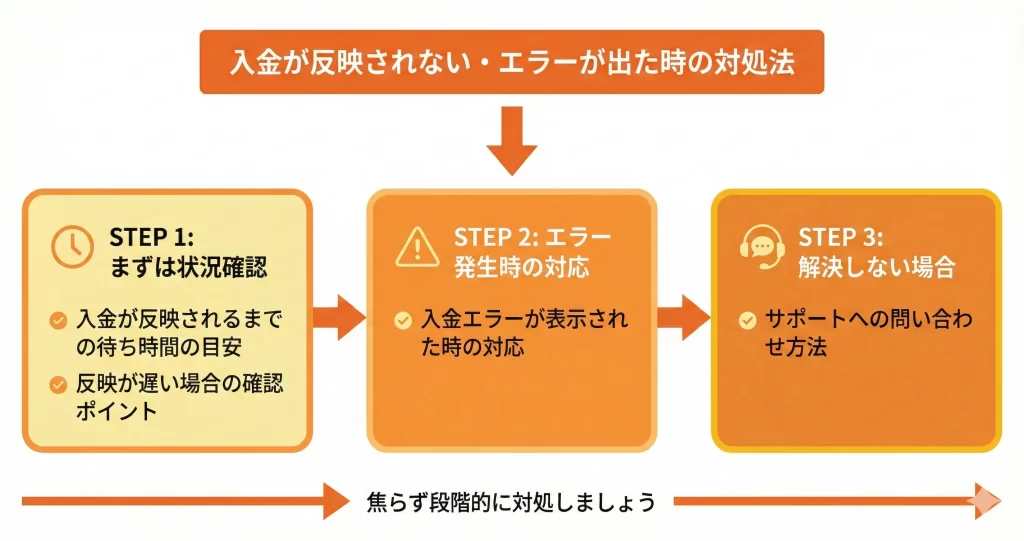 問い合わせの際は、入金日時、使用した入金方法、入金額、取引IDや参照番号などの情報を整理しておくとスムーズに対応してもらえます。