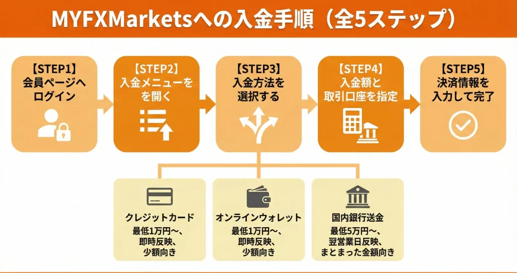 MYFXMarketsへの入金は、会員ページから基本的な5つのステップで完了します。