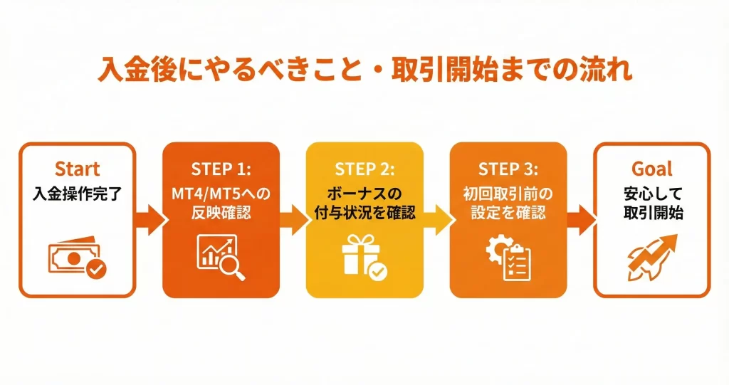 入金操作が完了しても、実際に取引を開始するには反映確認や初期設定の確認が必要です。