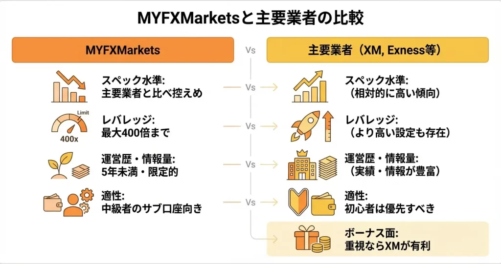ここでは代表的な業者との比較を通じて、MYFXMarketsを選ぶべき条件と、他社を検討した方がよいケースを整理します。