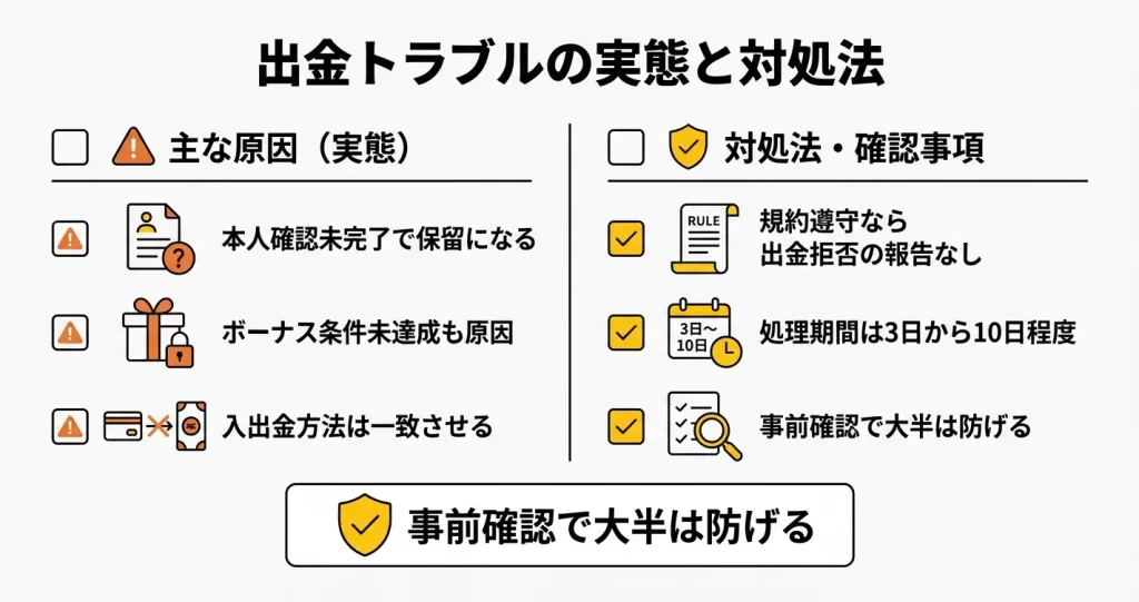 正当な理由なく出金を拒否される事例は基本的に確認されていません。