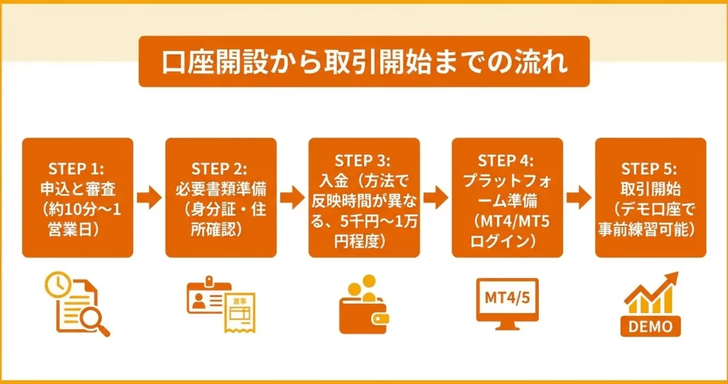 ここでは、必要な書類や所要時間、入金方法の選択肢、取引開始までの具体的な手順を順に解説します。事前に全体の流れを把握しておくことで、スムーズに利用を開始できます。