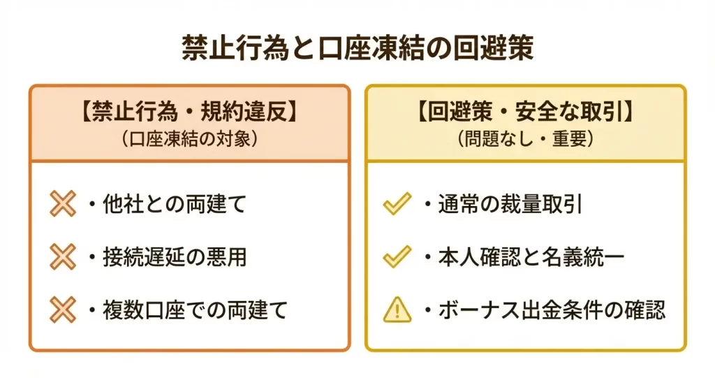 さらに、禁止取引や複数口座間での両建て取引など、規約で明示的に禁止されている取引を行った場合、利益の取り消しや出金拒否の対象となります。