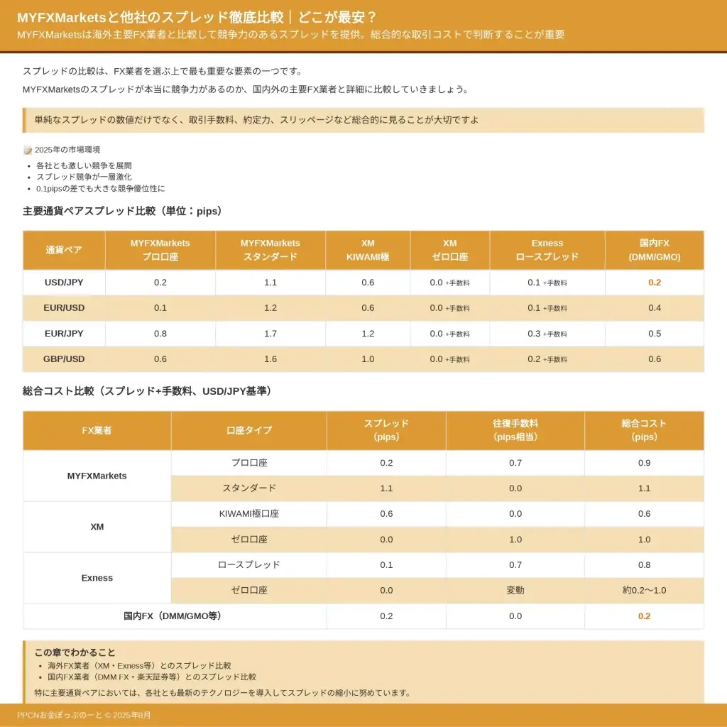 この記事では、MYFXMarketsの全通貨ペアの最新スプレッド一覧から、XMやExness等の海外FX業者、DMM FXや楽天証券等の国内業者との詳細比較、MT4でのスプレッド確認方法まで紹介します。