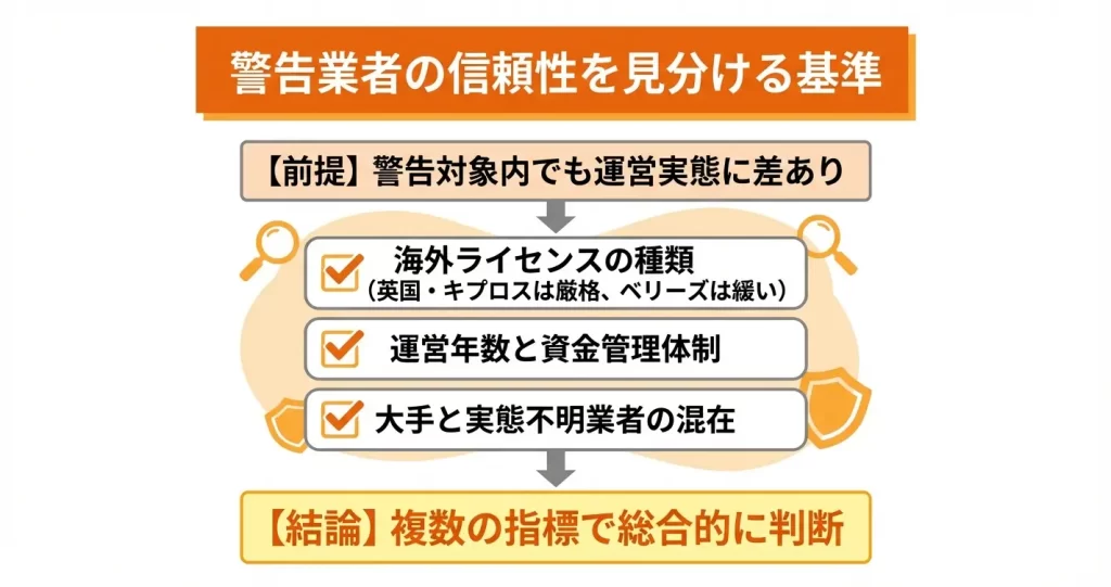 警告対象であることは、日本国内での法的保護が受けられないという共通のリスク要因です。しかし、海外ライセンスの有無、運営実績、資金管理体制といった信頼性指標を組み合わせて総合的に判断することで、より慎重なリスク管理が可能になります。