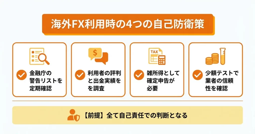 海外FX利用には金融庁の警告に象徴される複数のリスクが伴いますが、自己防衛策を講じることでトラブル遭遇の可能性を下げることは可能です。