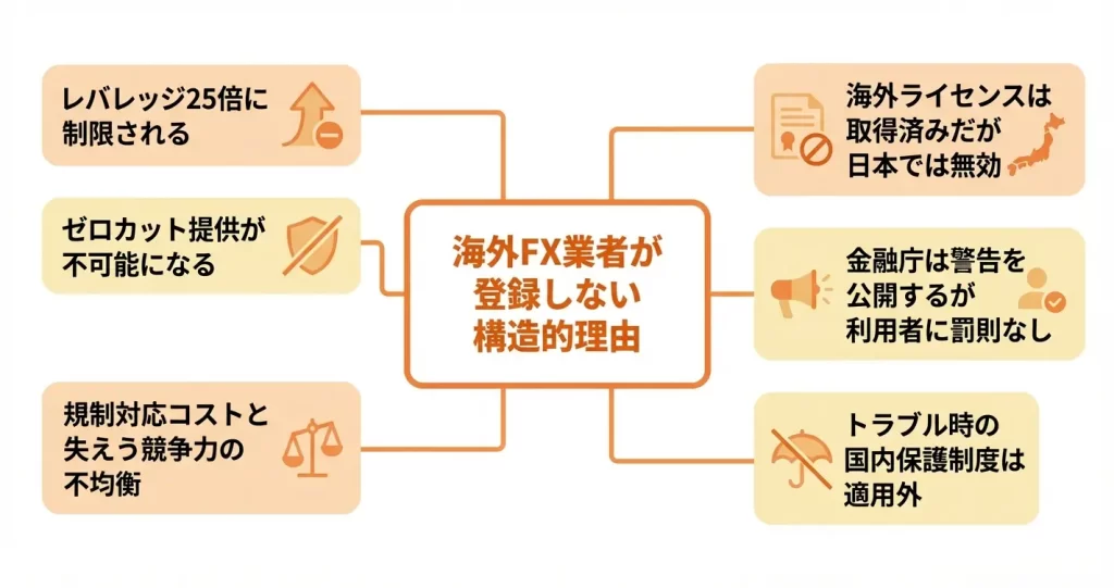 海外FX業者の多くは、金融庁への登録を行わずに日本居住者向けのサービスを提供しています。これは法令遵守の意識が低いためではなく、日本の登録制度と海外FX業者のサービス設計に構造的な不一致があるためです。