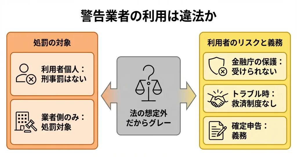 ただし、警告対象業者を利用することは法律で禁止されているわけではないものの、日本の法規制の保護対象外となるため、実質的なリスクが存在します。