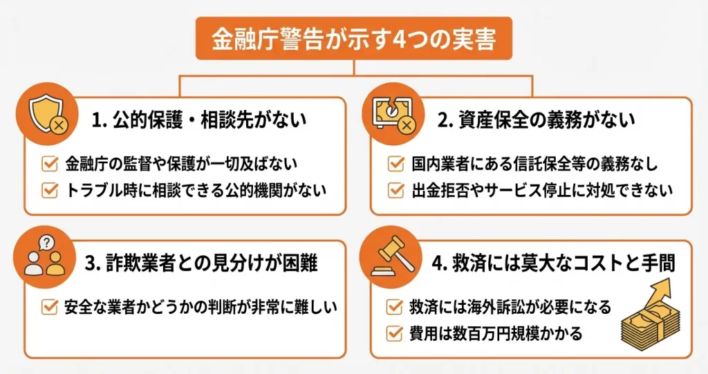 この「保護が受けられない」状態が実生活で意味するのは、例えば出金拒否や業者の突然のサービス停止が起きた際、日本の金融当局への相談や苦情申し立てができず、預けた資金の回収が事実上困難になるという事態です。