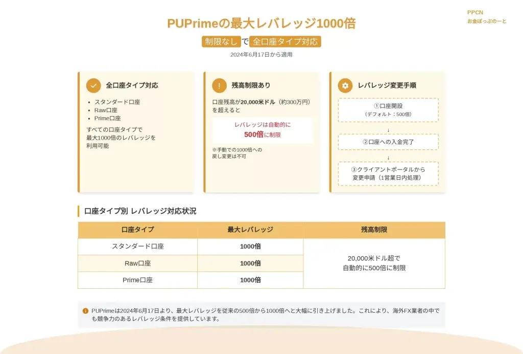 PUPrimeは2024年6月17日より、最大レバレッジを従来の500倍から1000倍へと大幅に引き上げました。