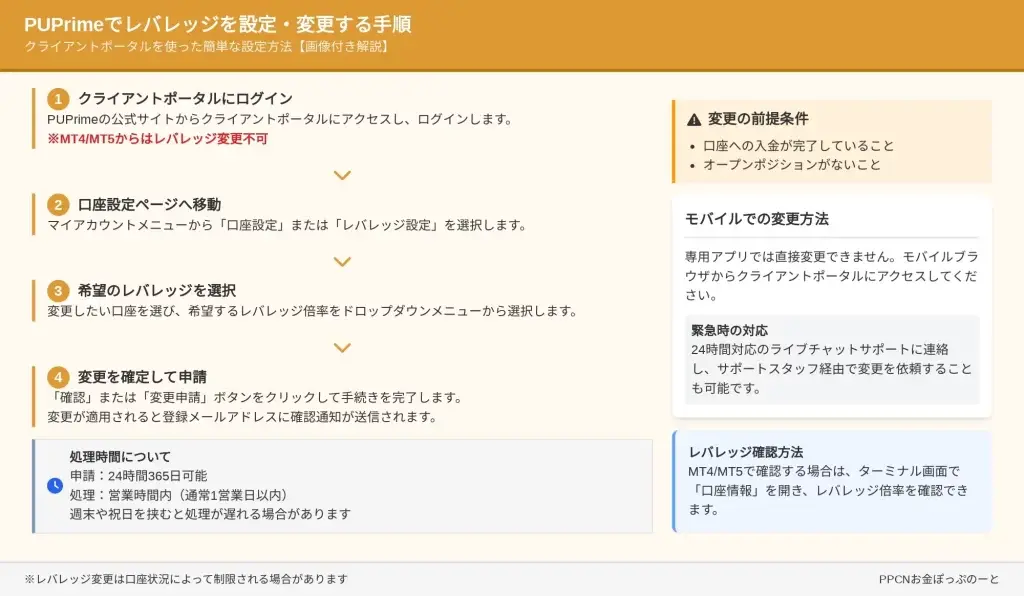 重要なポイントは、レバレッジの変更はMT4やMT5のプラットフォーム上からは行えず、必ずPUPrimeのクライアントポータルを通じて行う必要があることです。