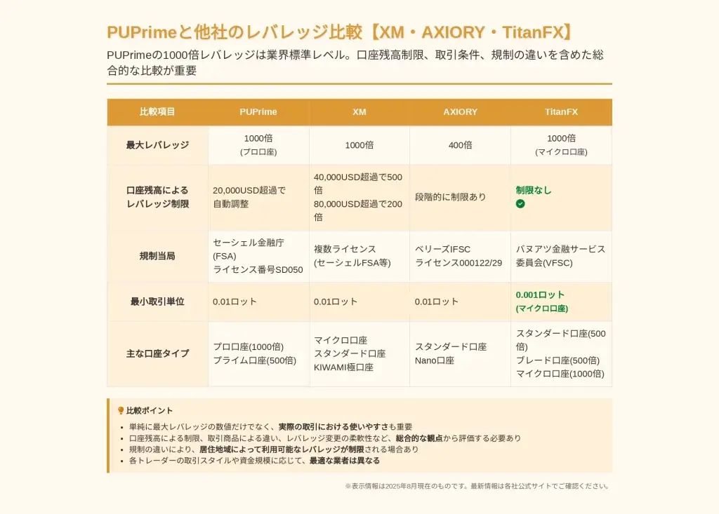 ここでは、主要な競合他社であるXM、AXIORY、TitanFXとの詳細な比較を行い、PUPrimeの優位性と課題を明らかにします。