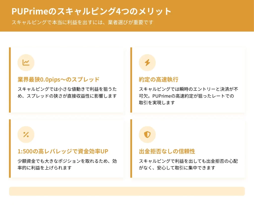 スキャルピングで本当に利益を出すには、業者選びが重要なんです!PUPrimeの4つの強みを詳しく見ていきましょう。