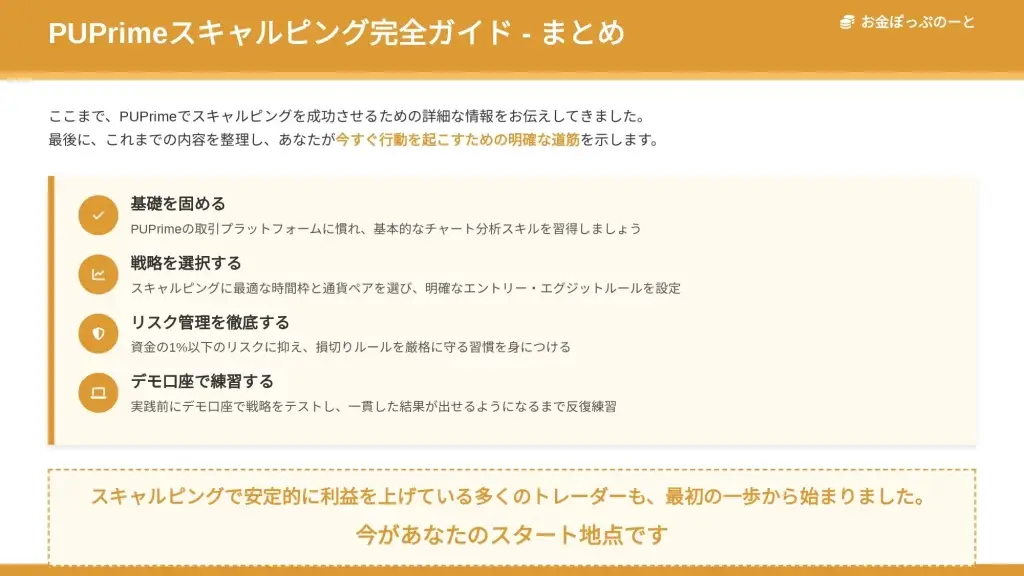 PUPrimeでスキャルピングを行う際の、絶対に守るべきリスク管理の原則を再度強調します。