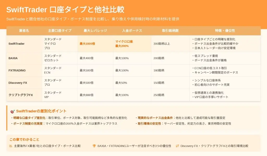 また、他の海外FX業者から乗り換えを検討している場合、SwiftTraderの口座タイプが持つ独自の優位性を理解することが重要です。