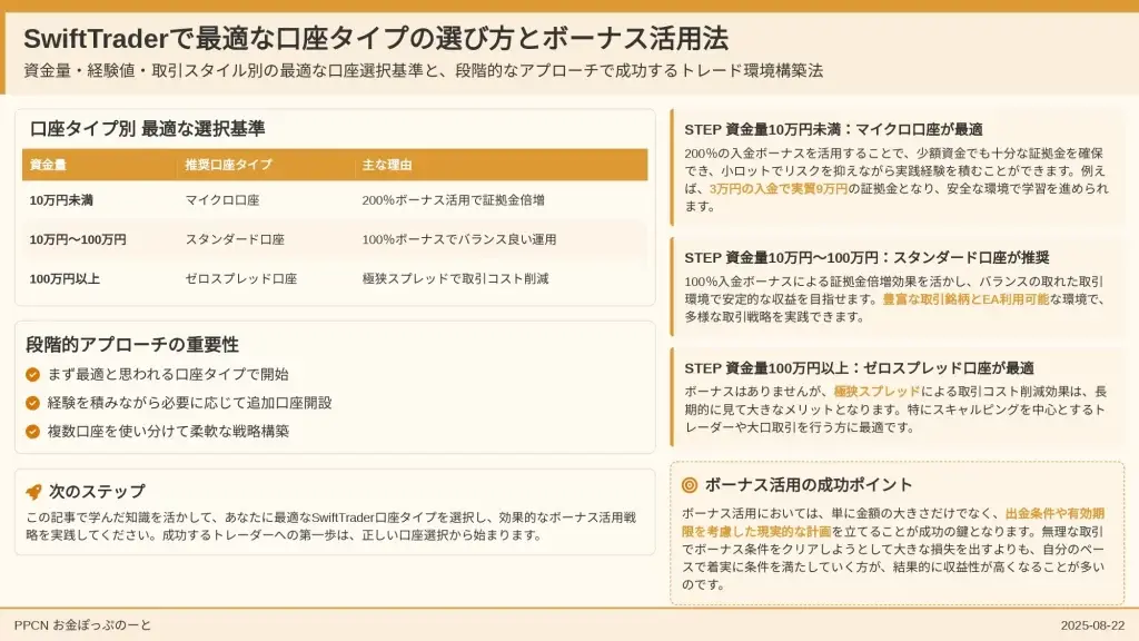 まとめ:SwiftTraderで最適な口座タイプの選び方とボーナス活用法