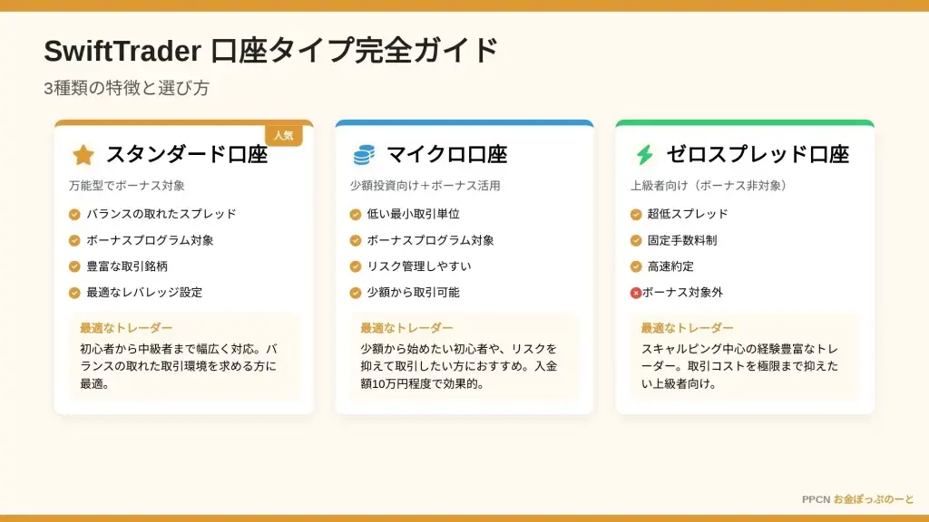 SwiftTrader 口座タイプ完全ガイド|3種類の特徴と選び方