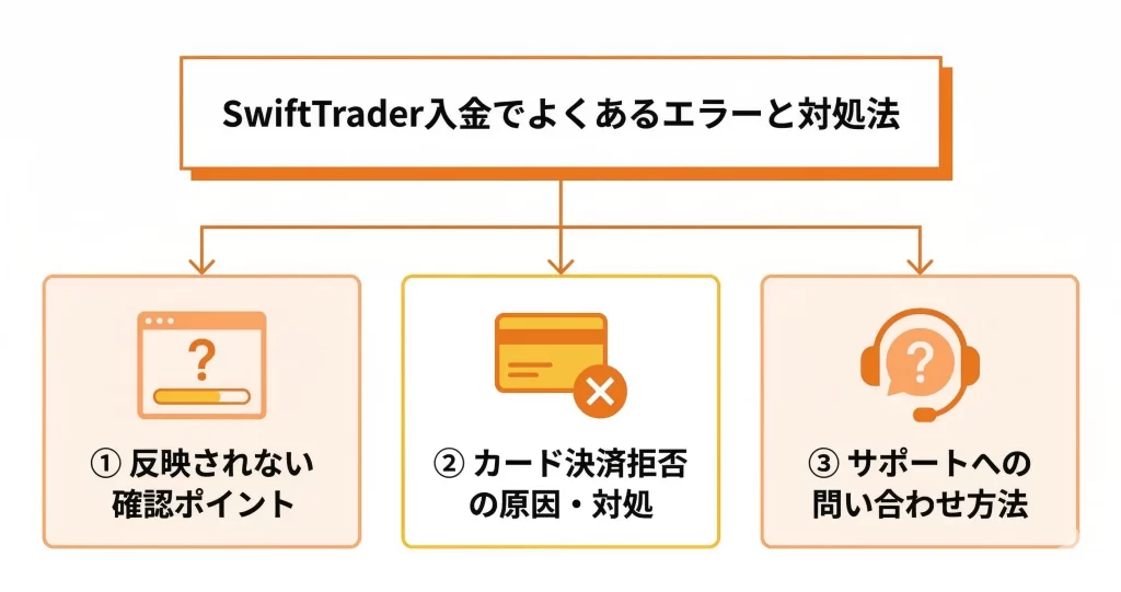 最も多いのは、振込人名義の不一致です。SwiftTraderに登録した氏名と振込時の名義が一致しない場合、自動処理が行われず入金が保留されます。