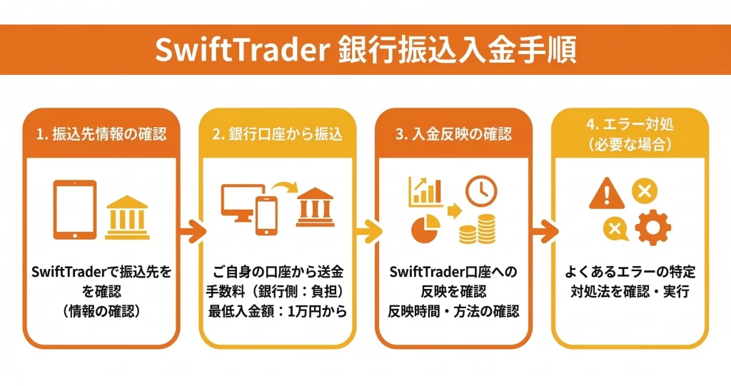 | 国内銀行振込 | 銀行の振込手数料のみ(数百円程度)、SwiftTrader側は無料が多い | 営業日1〜3日程度 | 5,000円〜10,000円程度 |