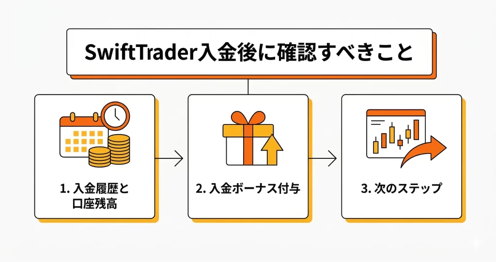 このセクションでは、入金が正常に完了したかを確認する手順と、ボーナスの付与状況、取引開始前にチェックすべき項目を順に解説します。