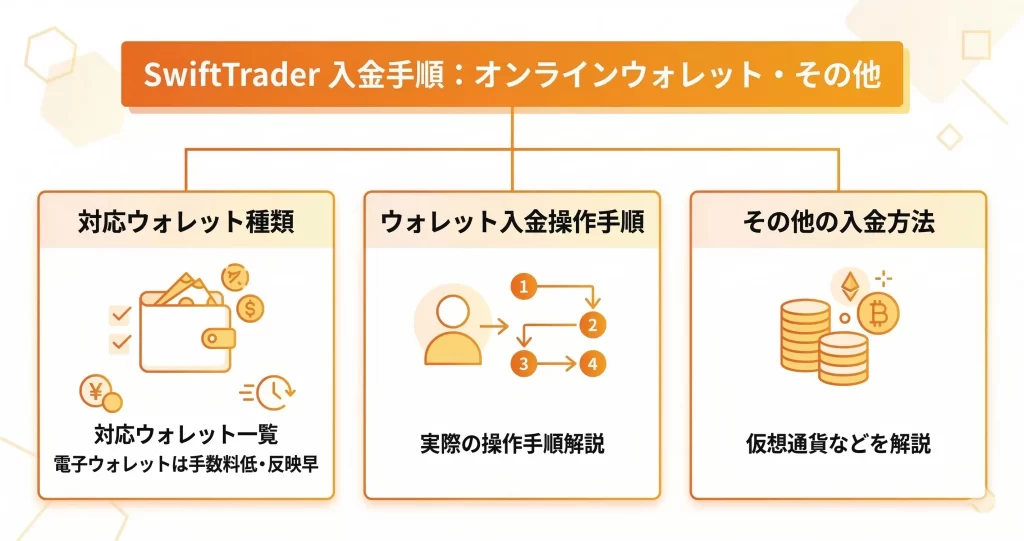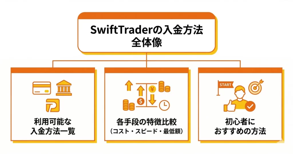 SwiftTraderでは複数の入金方法が用意されており、それぞれ手数料や反映時間が異なります。