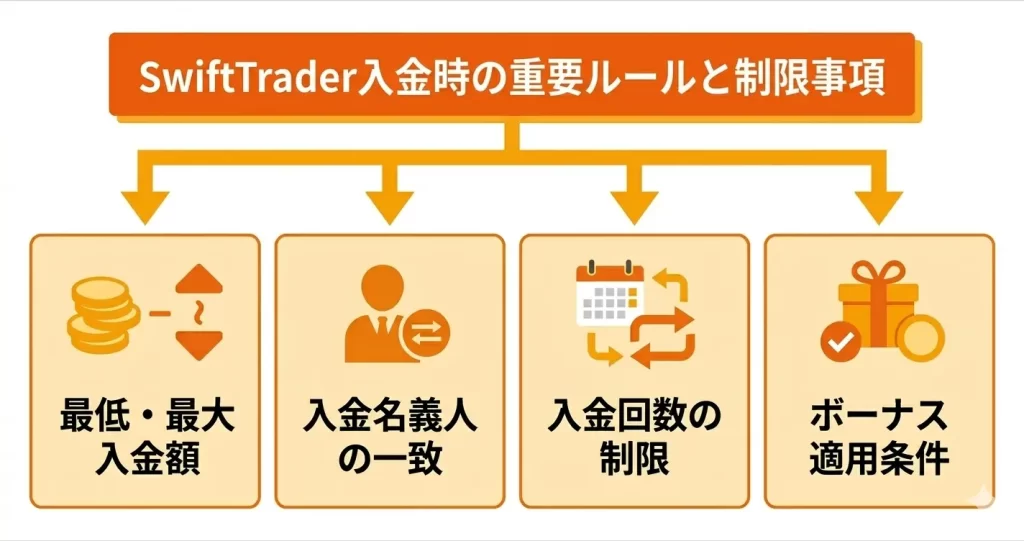 振込人名義は、SwiftTraderに登録している本人名義と完全に一致させる必要があります。家族名義や法人名義での振込は、入金処理が保留される原因となるため避けてください。