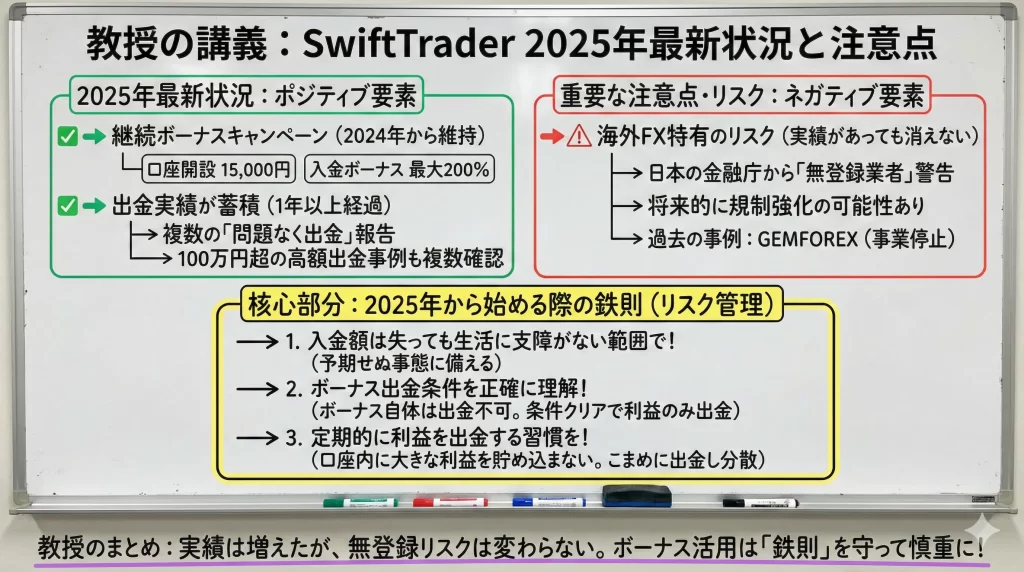 2025年12月時点での最新状況として、SwiftTraderにおける出金拒否の報告は確認されていません。