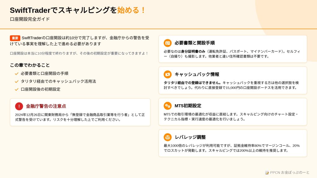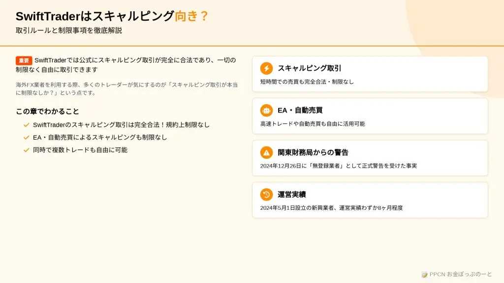 本記事では、SwiftTraderがスキャルピングに適しているのか、口座タイプごとのスプレッドや手数料、約定力といった取引環境の評価はもちろんのこと、関東財務局から警告を受けた運営会社の信頼性と安全性について徹底的に検証します。