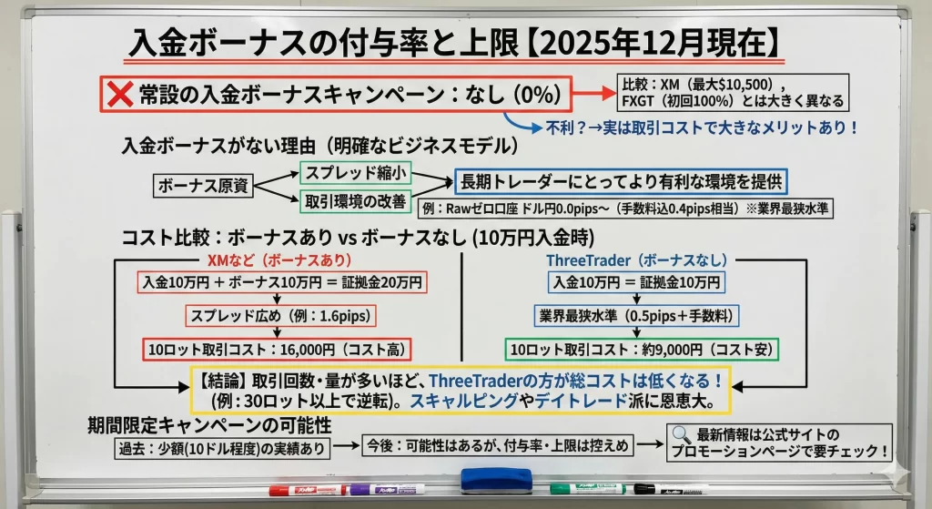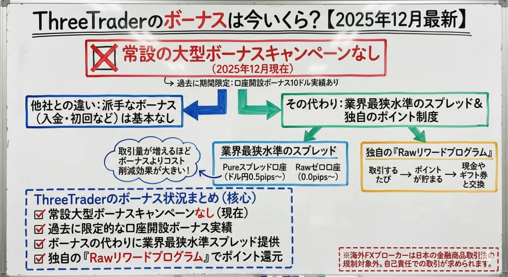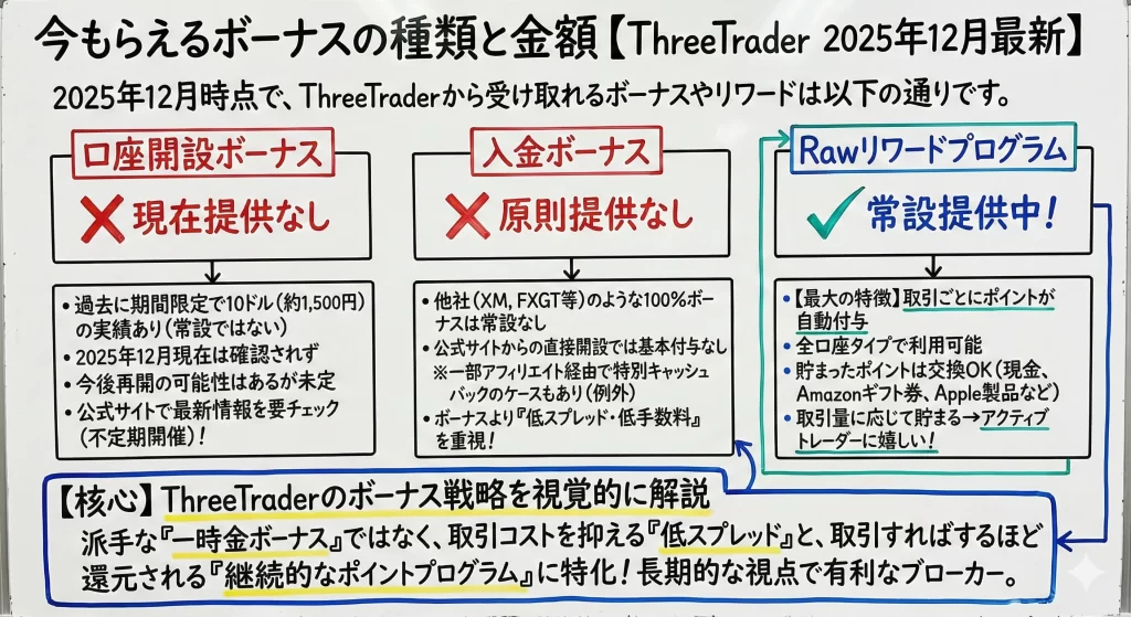 ThreeTraderは低コスト戦略を取るブローカーですが、実際にどんなボーナスが用意されているのか、2025年12月最新の情報を把握することが重要です。