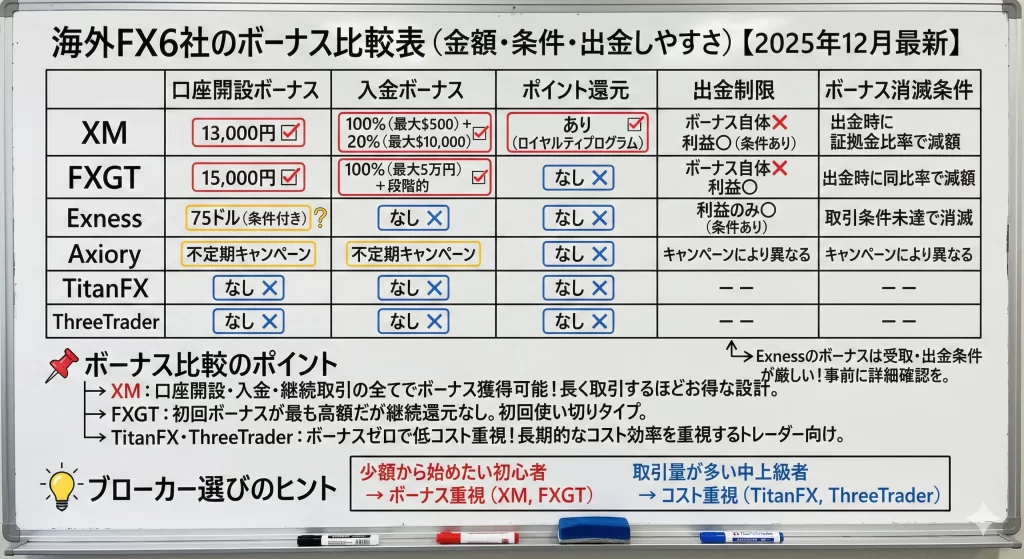 さらに、XMやFXGTなど海外FX主要6社との比較表で、ボーナス額・出金条件・取引コスト面での優位性を数値で検証。