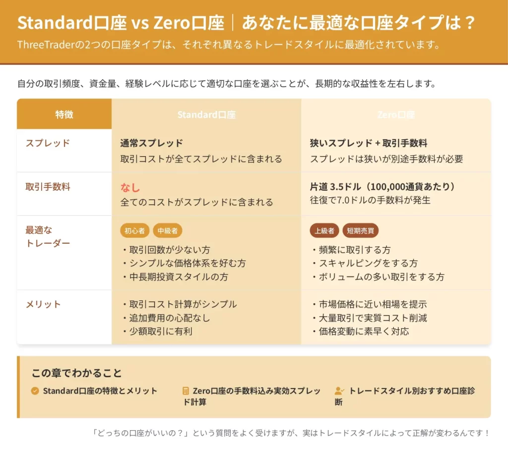 ThreeTraderは「業界最狭レベルのスプレッド」を強みとしていますが、表示されているスプレッドと実際の取引環境には差があることも多く、口座選びを間違えると年間で数十万円の取引コストの差が生まれてしまいます。