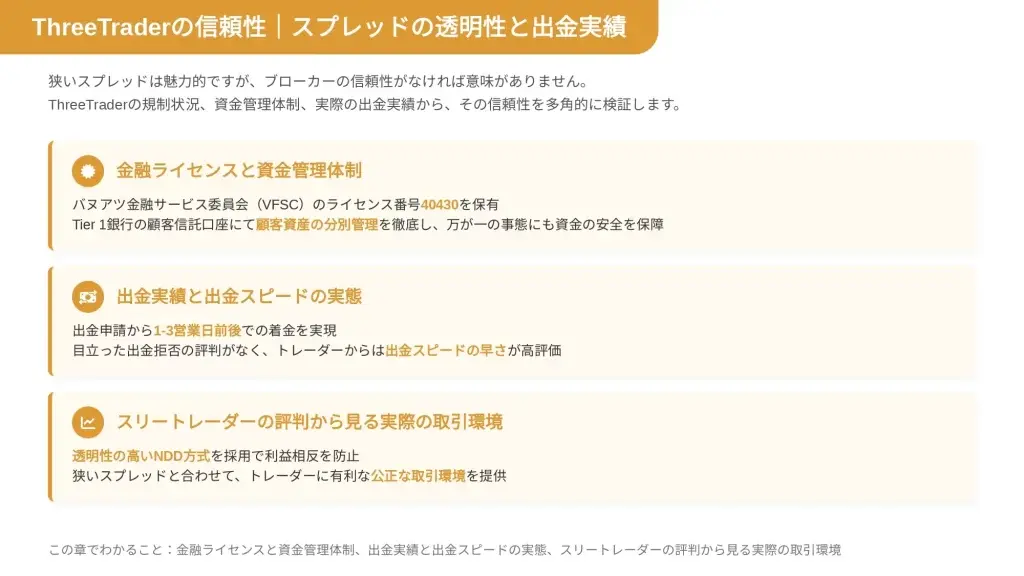 ThreeTraderは、業界最狭水準のスプレッドという明確な強みを持つ一方で、規制面でのリスクも存在します。