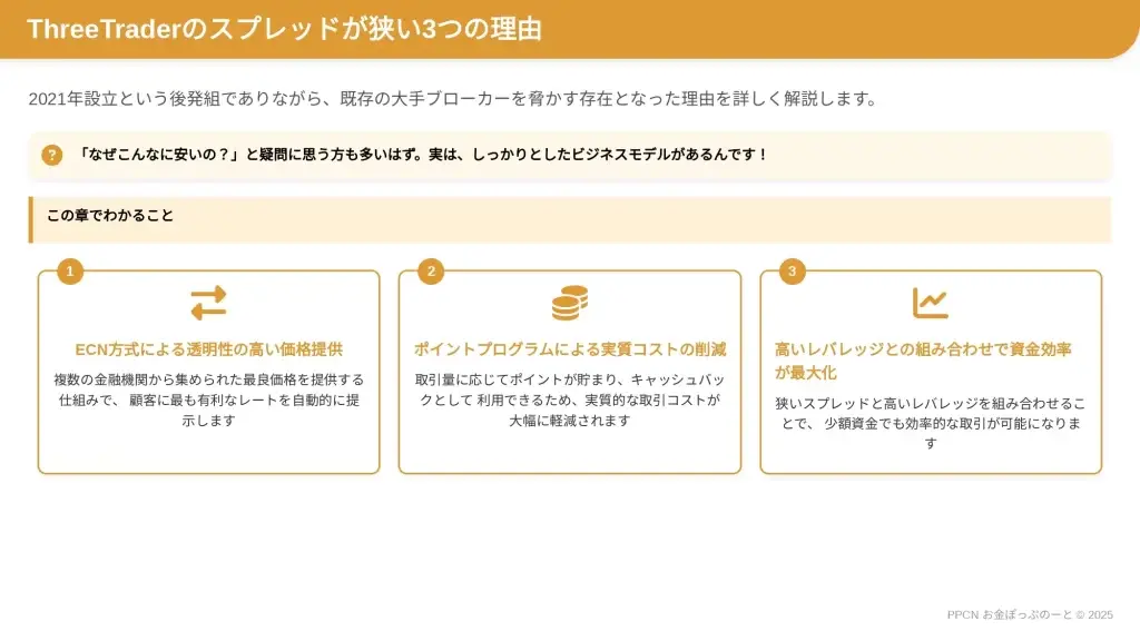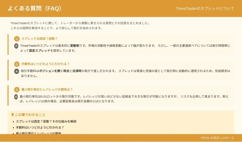 この記事を読めば、ThreeTraderのスプレッドの真の実力を把握し、あなたの取引スタイルに最適な口座選択ができるようになり、年間の取引コストを最小限に抑えながら効率的な利益追求が可能になります。