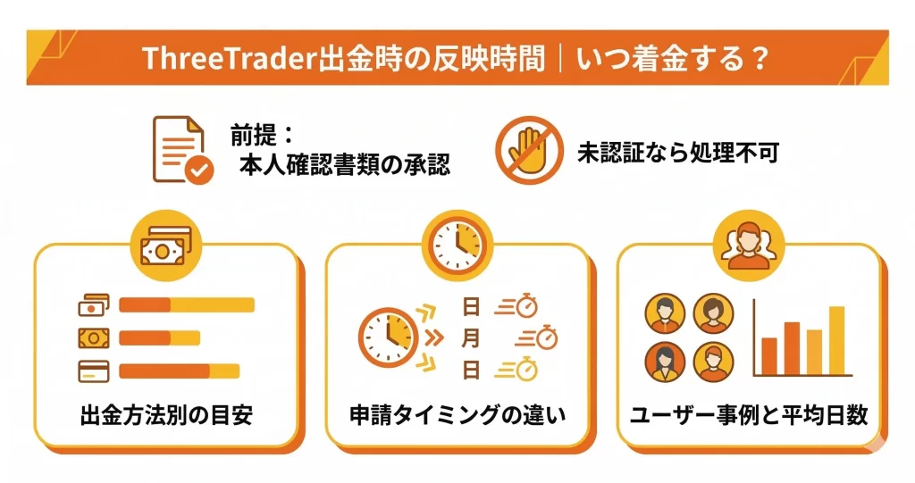 出金リクエスト後、ThreeTrader側の処理は通常1〜3営業日で完了し、その後国内銀行の営業日に応じて着金するため、合計で3〜5営業日程度を見込んでおくと安全です。