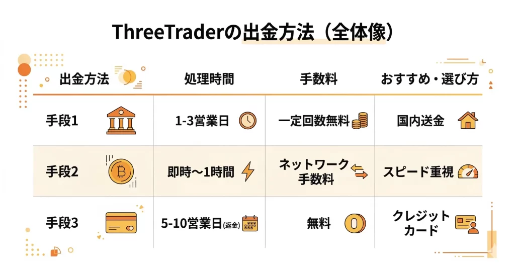 このセクションでは、ThreeTraderで利用できる出金方法の全体像と、各手段の処理時間・手数料などの違いを整理し、自分に合った出金方法を選ぶための判断材料を提供します。