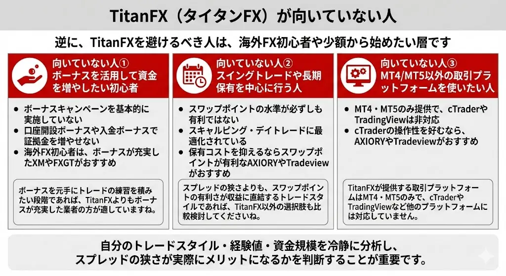 一方でTitanFXが向いていないのは、豊富なボーナスを活用して資金効率を高めたい初心者や、信託保全による完全な資金保護を求めるトレーダーです。