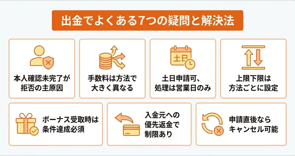 事前に疑問を解消しておくことで、スムーズかつ安心して出金手続きを完了できます。
