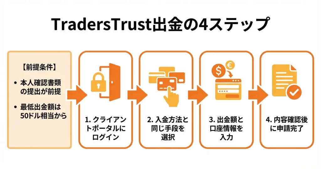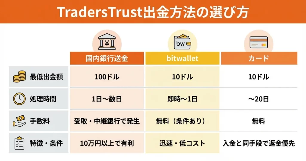TradersTrustは複数の出金方法を提供しており、手数料・処理時間・最低出金額が異なるため、自分の状況に合わせた選択が重要です