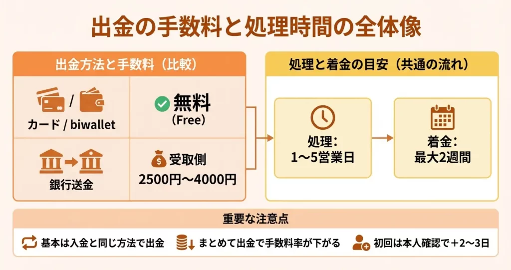 このセクションでは、各出金方法の手数料体系と処理時間の目安、そしてコストを抑えるための実務的なポイントを解説します。