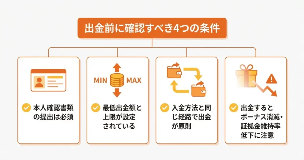 実際には出金方法ごとに手数料・処理時間・最低額が異なり、ボーナスの扱いや本人確認の有無によっても手続きの流れが変わります。