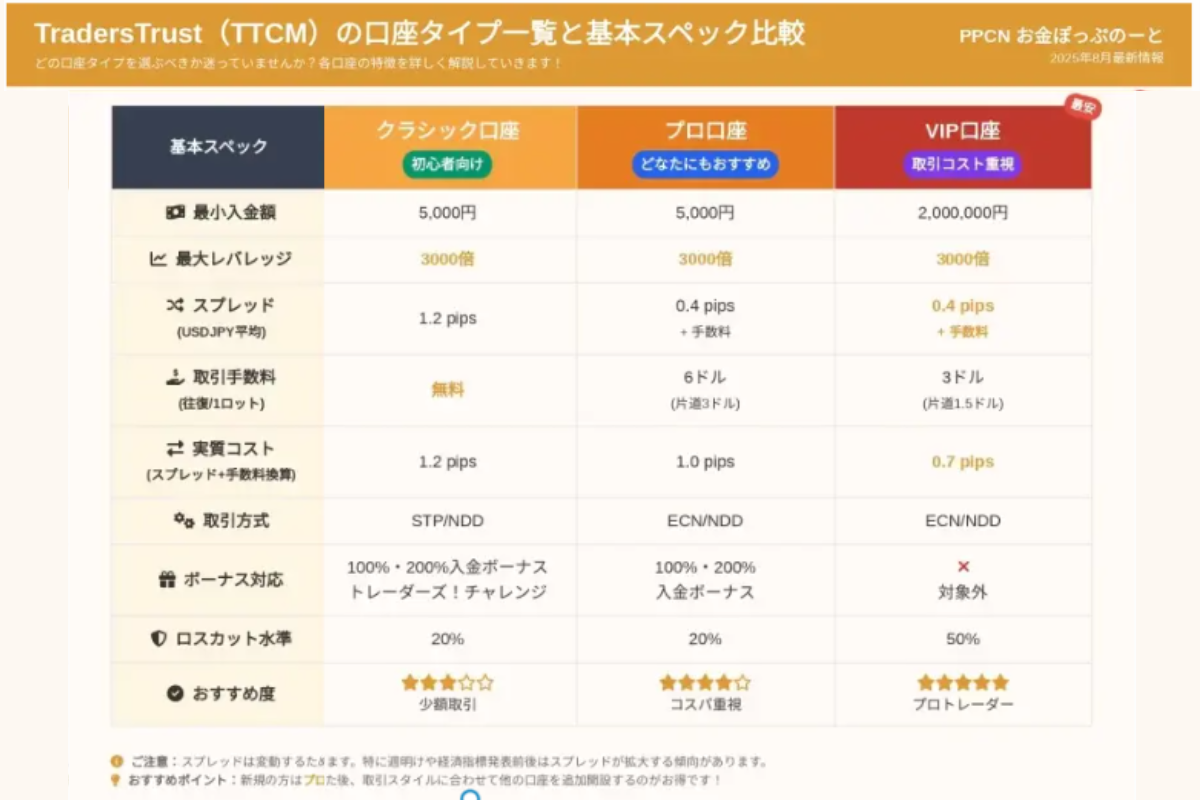 TradersTrust(TTCM)の口座タイプ一覧と基本スペック比較