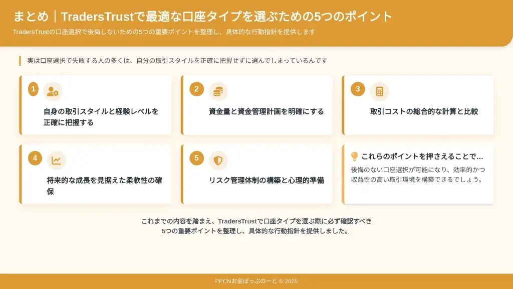 本記事で解説した5つのポイントを参考に、あなたにとって最適な口座タイプを選択し、成功への第一歩を踏み出してください。