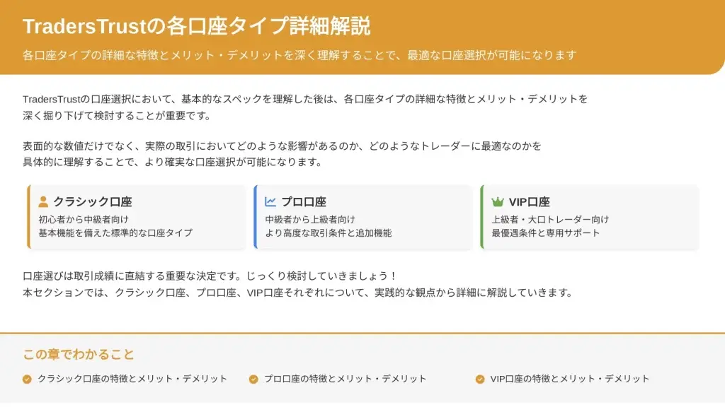 TradersTrustの口座選択において、基本的なスペックを理解した後は、各口座タイプの詳細な特徴とメリット・デメリットを深く掘り下げて検討することが重要です。