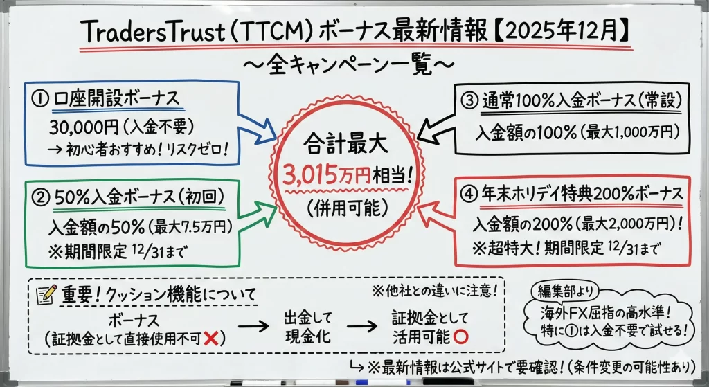 TradersTrust(TTCM)は2025年12月現在、口座開設ボーナスと通常入金ボーナス、2つの年末プロモーションの4種類のキャンペーンを実施しています。