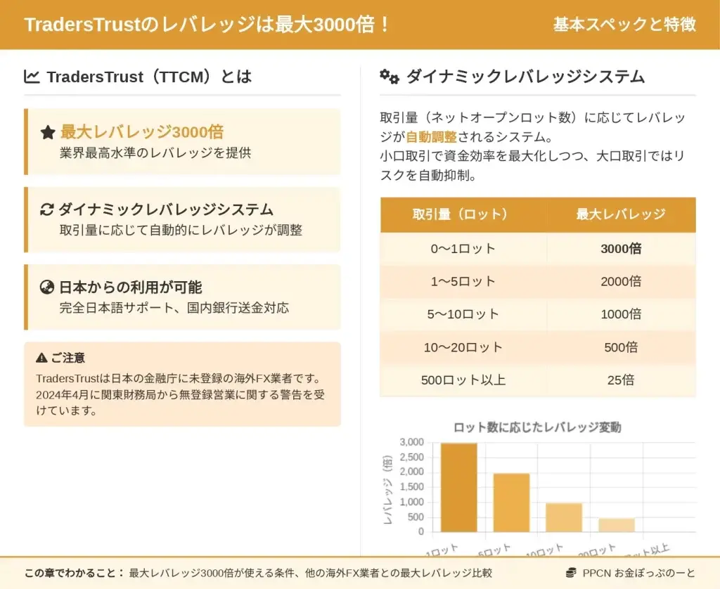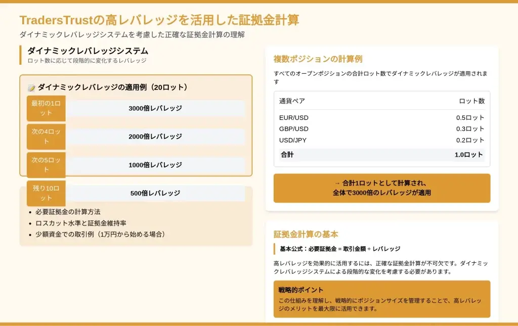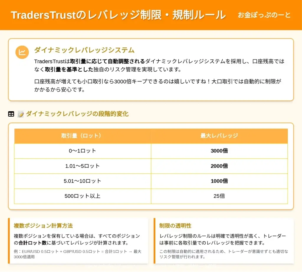 TradersTrustの最大の特徴は、単に高レバレッジを提供するだけでなく、リスク管理の観点から設計された「ダイナミックレバレッジシステム」を採用している点にあります。
