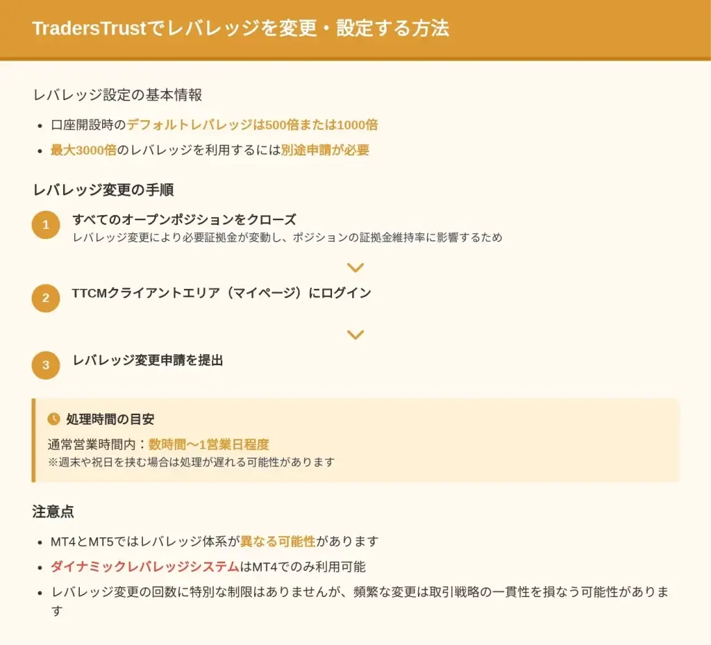 TradersTrustでのレバレッジ変更は、通常の営業時間内であれば2〜4時間程度で反映されます。