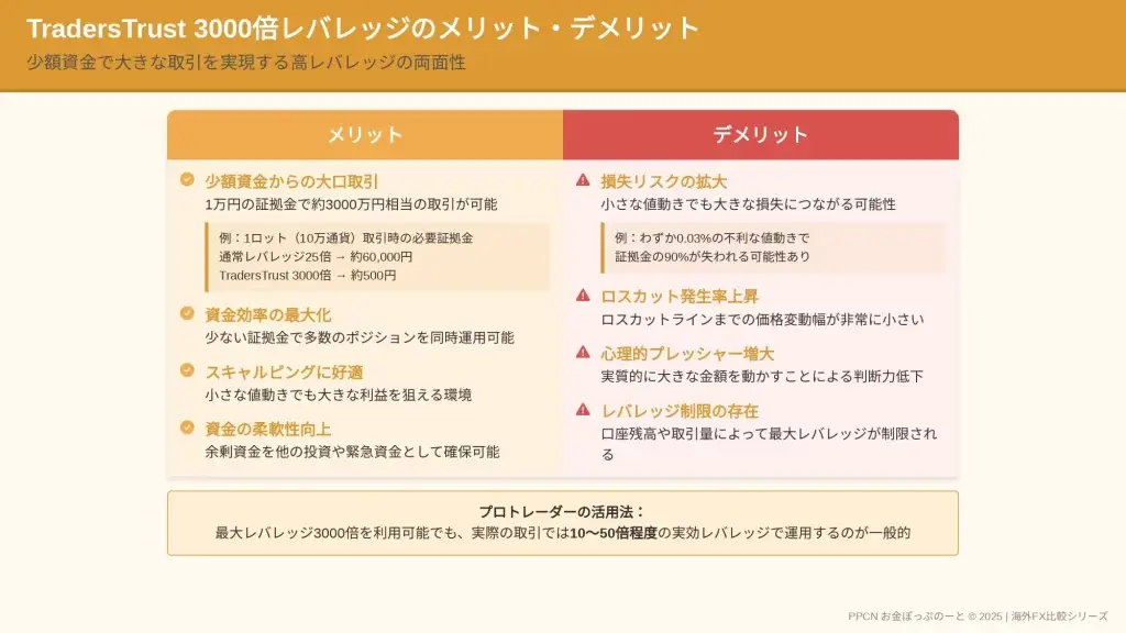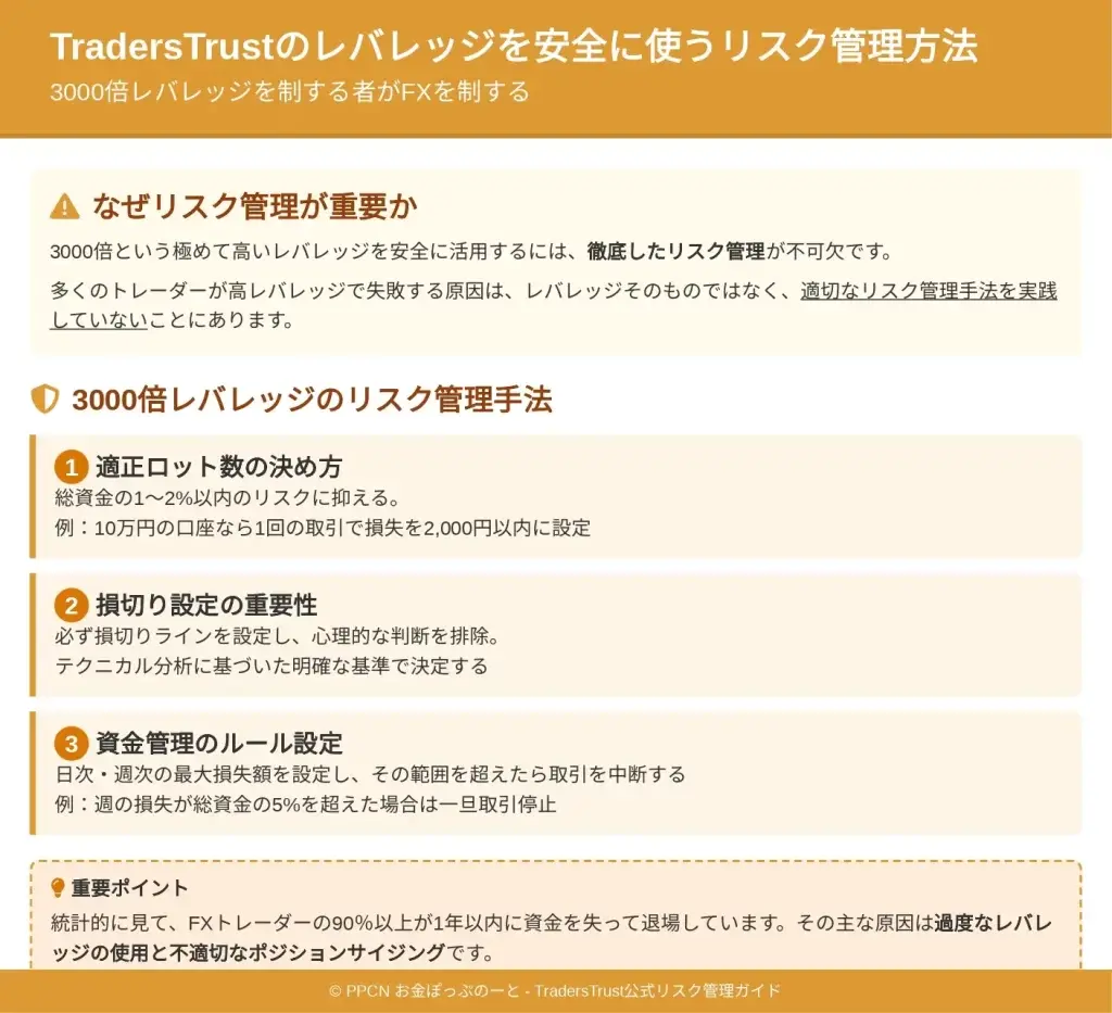 特にTradersTrustの3000倍という高レバレッジを安全に活用するには、正確な知識と適切なリスク管理が不可欠です。