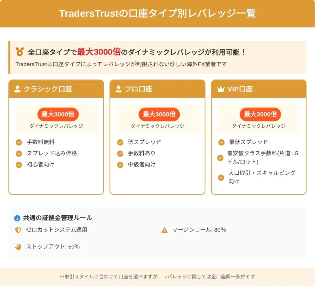 TradersTrustでは、クラシック口座、プロ口座、VIP口座の3つの口座タイプを提供しており、すべての口座タイプで最大3000倍のダイナミックレバレッジを利用できます。